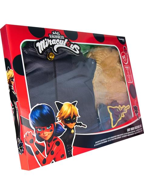 Inclui: Macacão, peruca, máscara, cinto, tornozeleiras, luvas, anel e boneco (Plagg) com caixa de presente