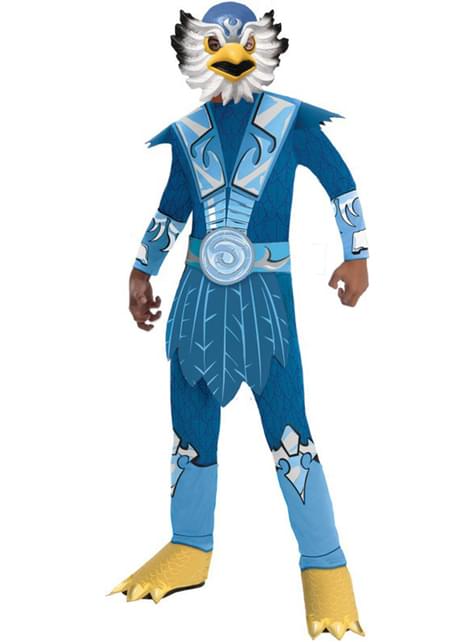Este nobre fato inclui um macacão azul com tapa botas incluídos que simulam as patas do pássaro, um cinto de espuma com o símbolo do ar na fivela, uma máscara com as penas da personagem, o bico moldado e aberturas nos olhos.