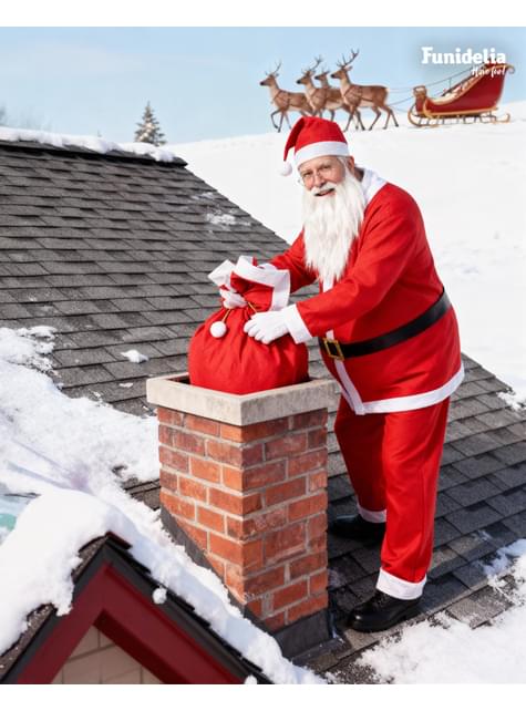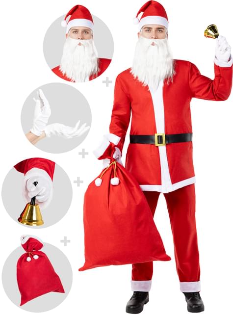 Inclui: Disfarce: Casaco, calças, cinto e gorro e acessórios: barba, luvas, saco e sino