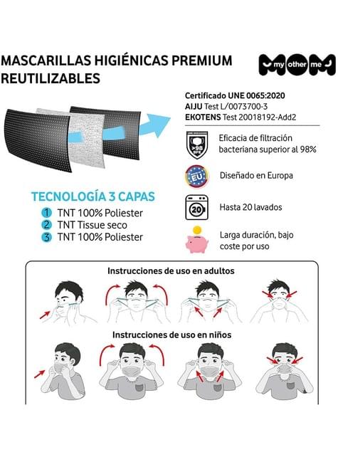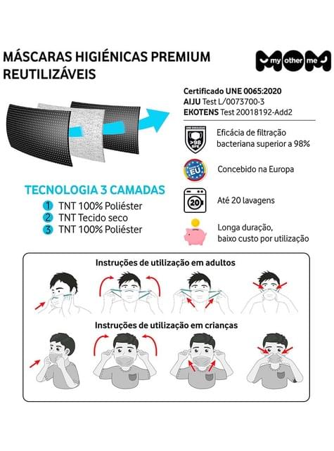 Inclui: 2 unidades com modelos diferentes de máscara higiénica reutilizável homologada com a normativa UNE 0065:2020.