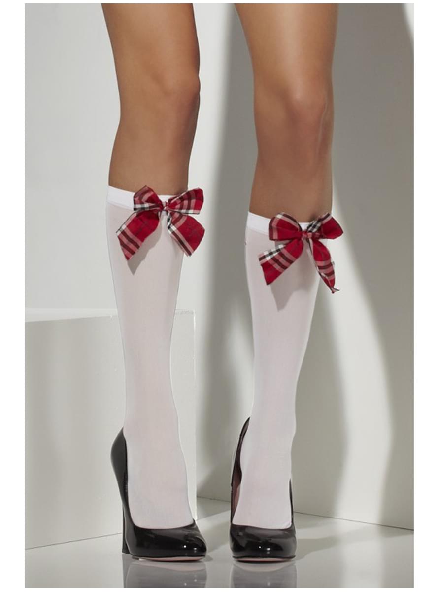 Inclui umas meias até aos joelhos de estudante, brancas, com uns laços aos quadrados.