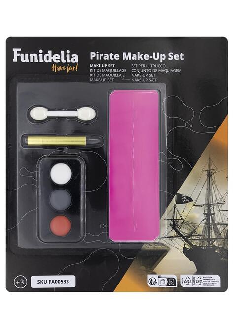 Inclui uma paleta de três cores (branco, preto e vermelho), aplicador duplo, lápis preto e três estênceis com temas de pirata como caveiras ou remendos. Sua textura cremosa permite aplicar a maquiagem de forma uniforme e confortável, conseguindo efeitos realistas com facilidade. A apresentação em blister com fundo de barco completa este divertido conjunto de aventuras.